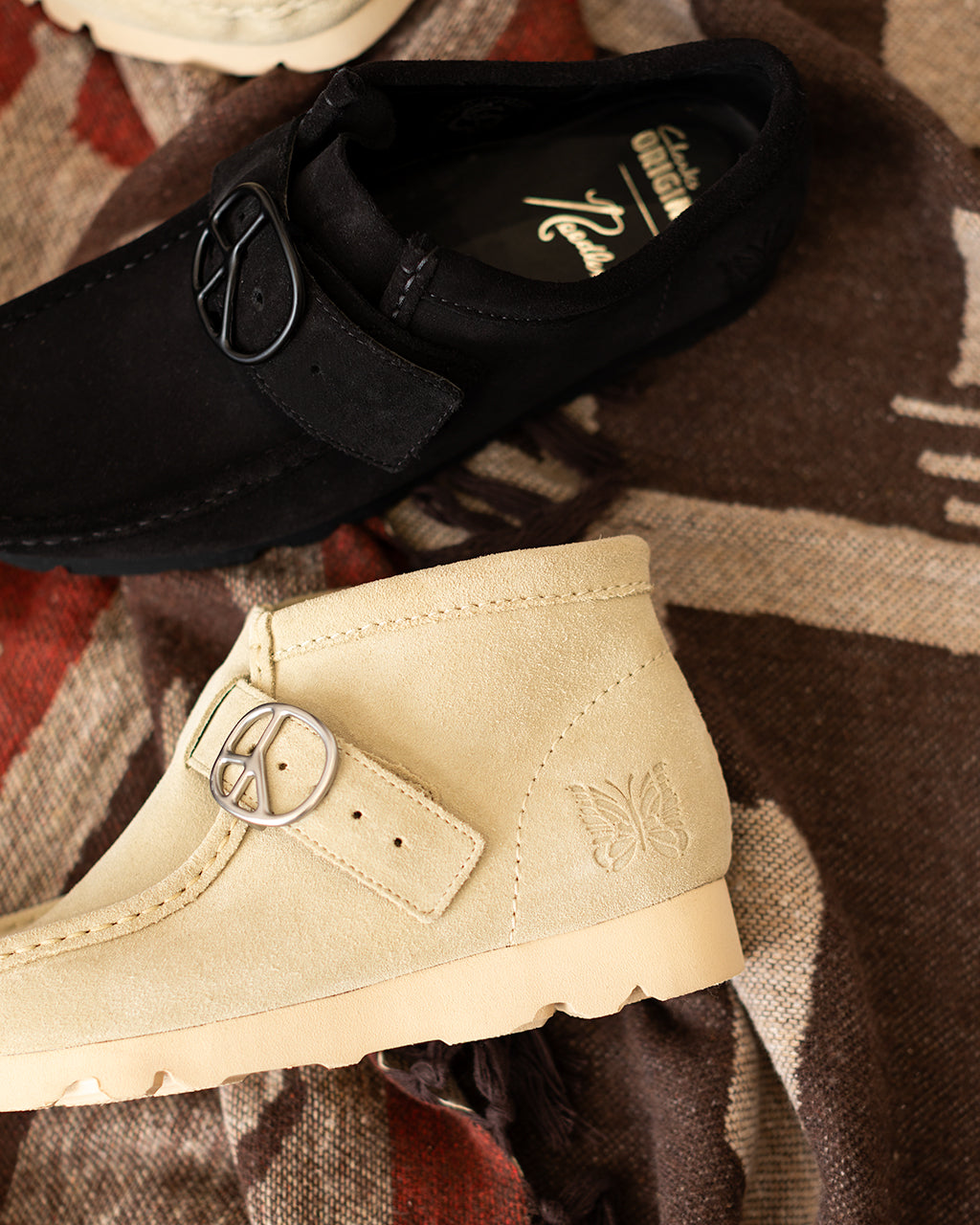 We’ve got two of the six styles available: the Wallabee Strap Low in Black Suede and the Wallabee Strap Boot in Maple Suede. Both come fitted with chunky peace sign buckles, oversized straps, and Vibram® soles for all-conditions grip. There’s co-branded detailing throughout, including a suede fob and embroidered Needles butterfly at the heel.