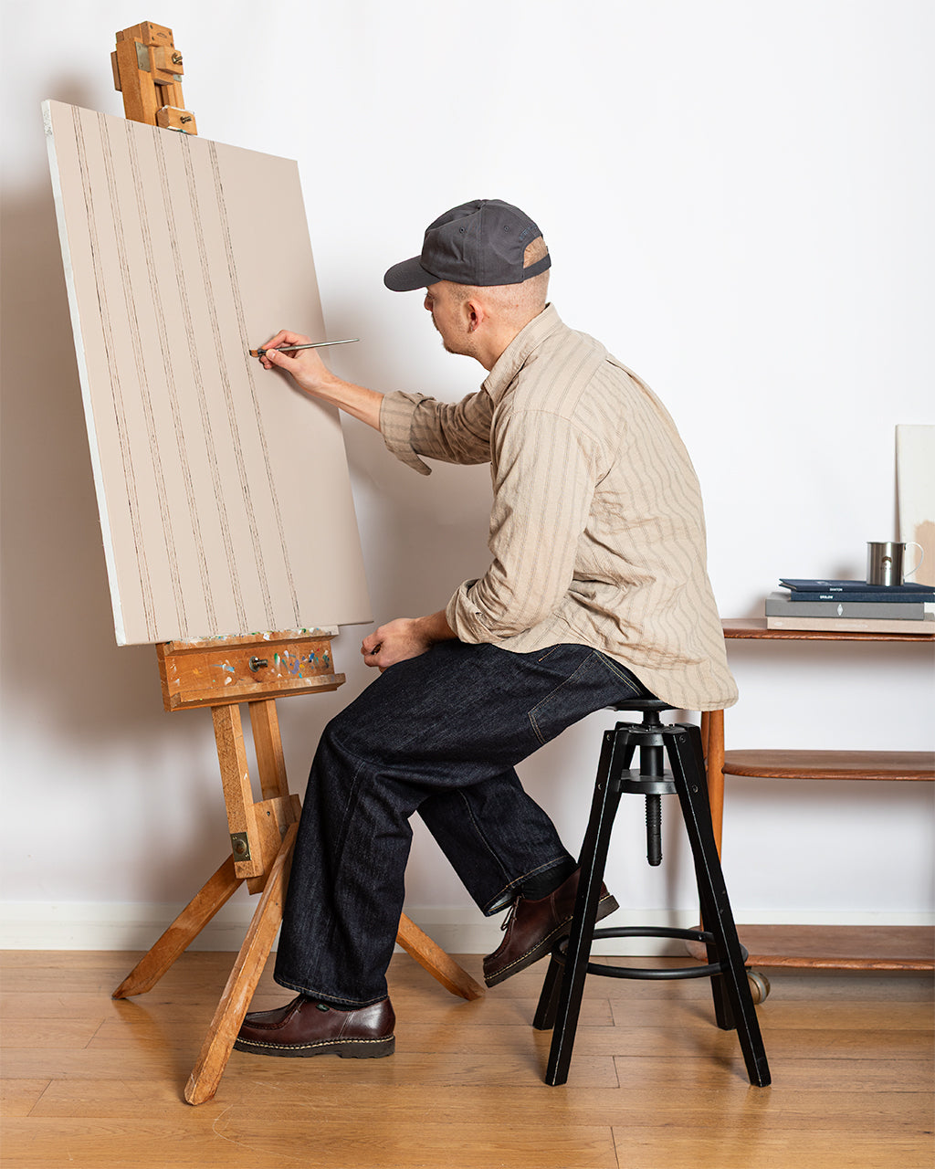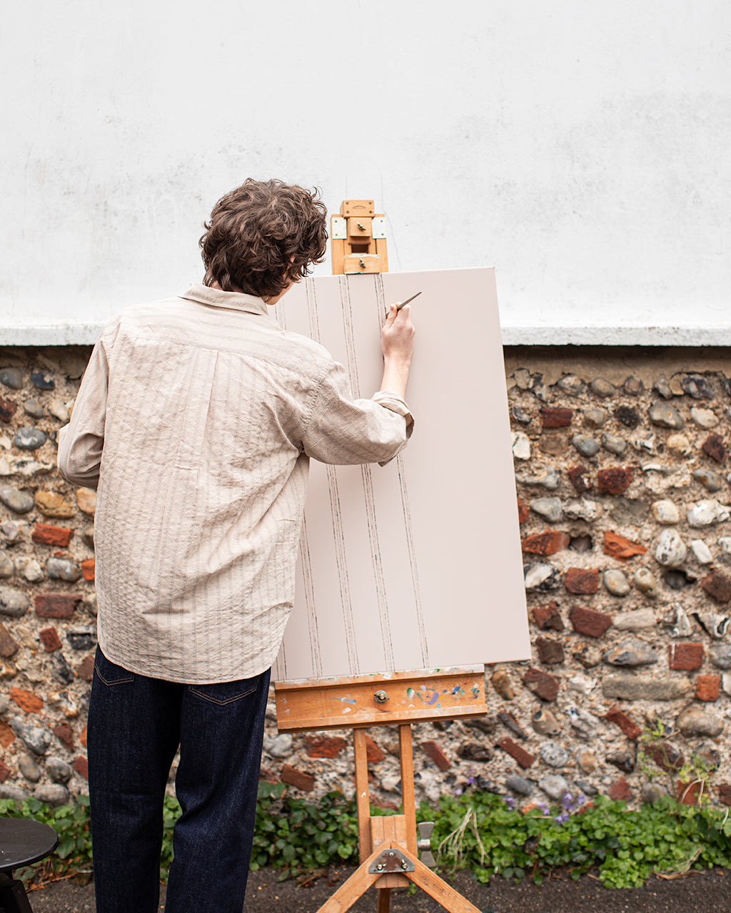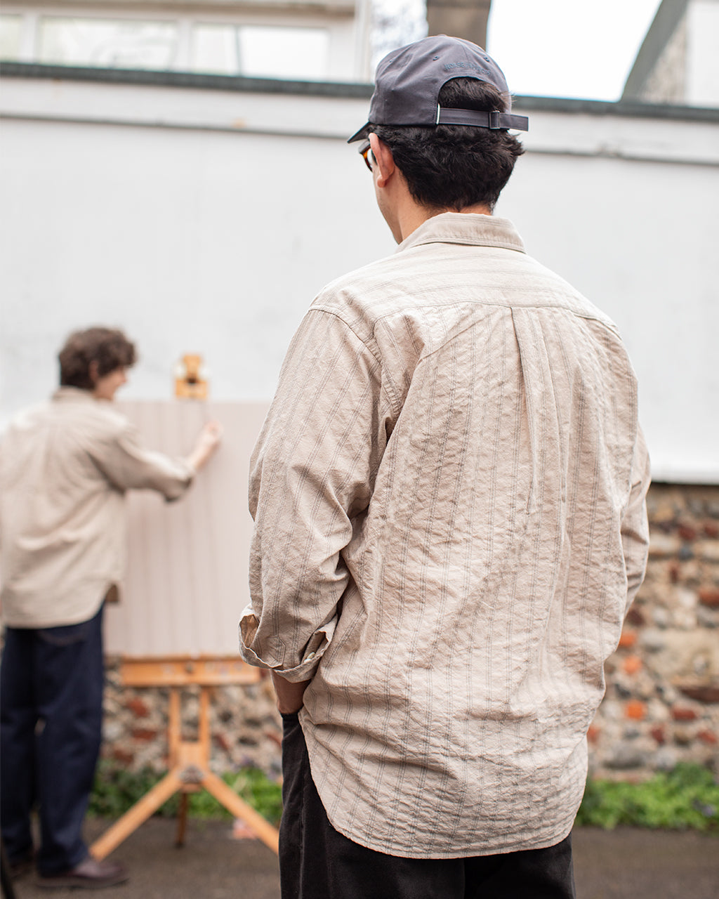 To mark the release, we created a short visual piece centred around the shirt’s defining detail - its woven stripe. The film begins tightly framed on an artist painting a set of repeating lines onto canvas. As the camera slowly pulls back, the scene widens to reveal the artist and his small audience, each wearing the Espevik. The painting becomes an echo of the garment itself, a quiet nod to pattern, repetition and the small design choices that make a piece worth returning to season after season.