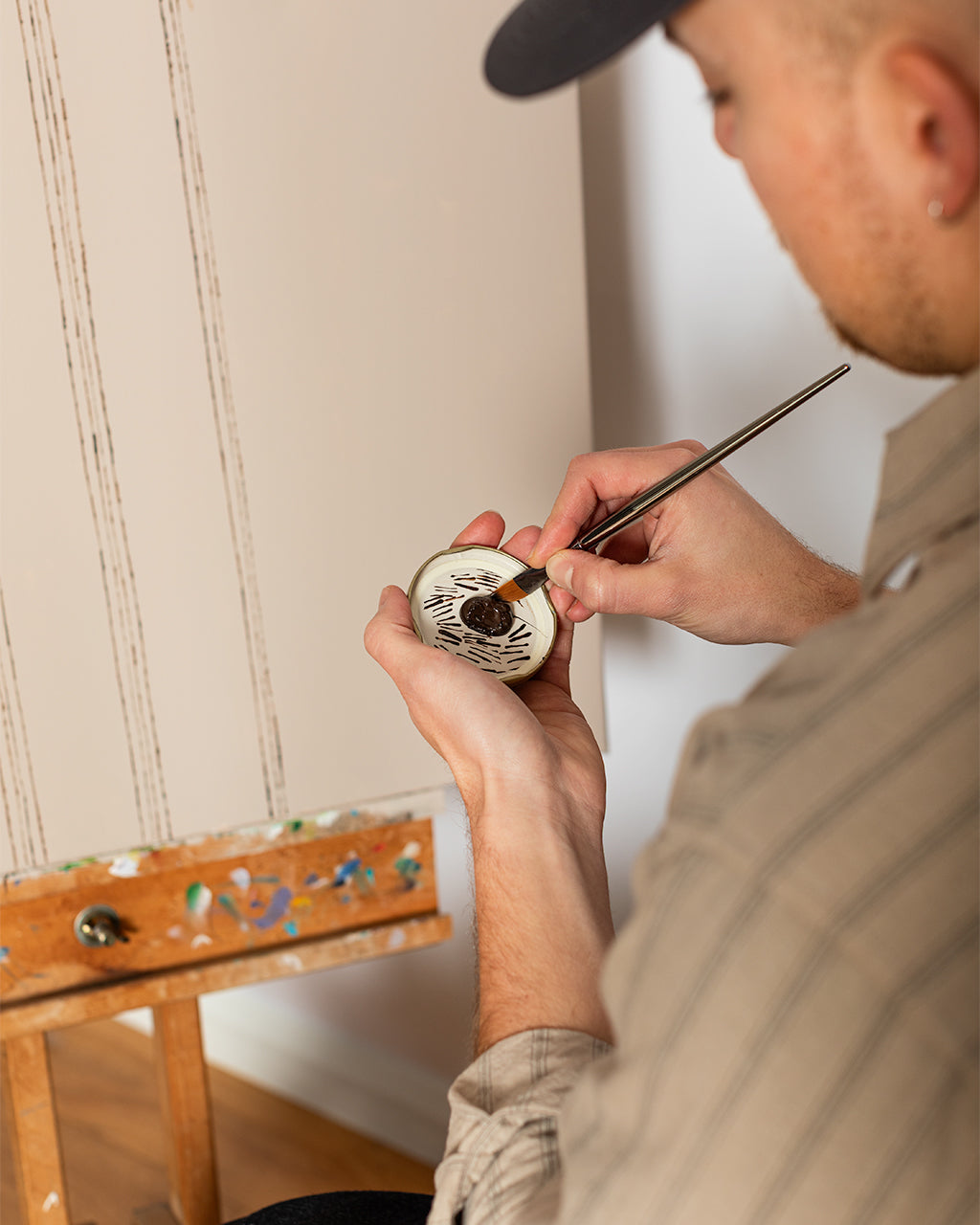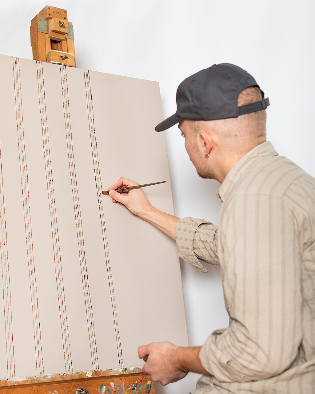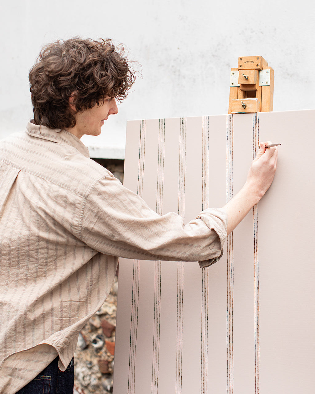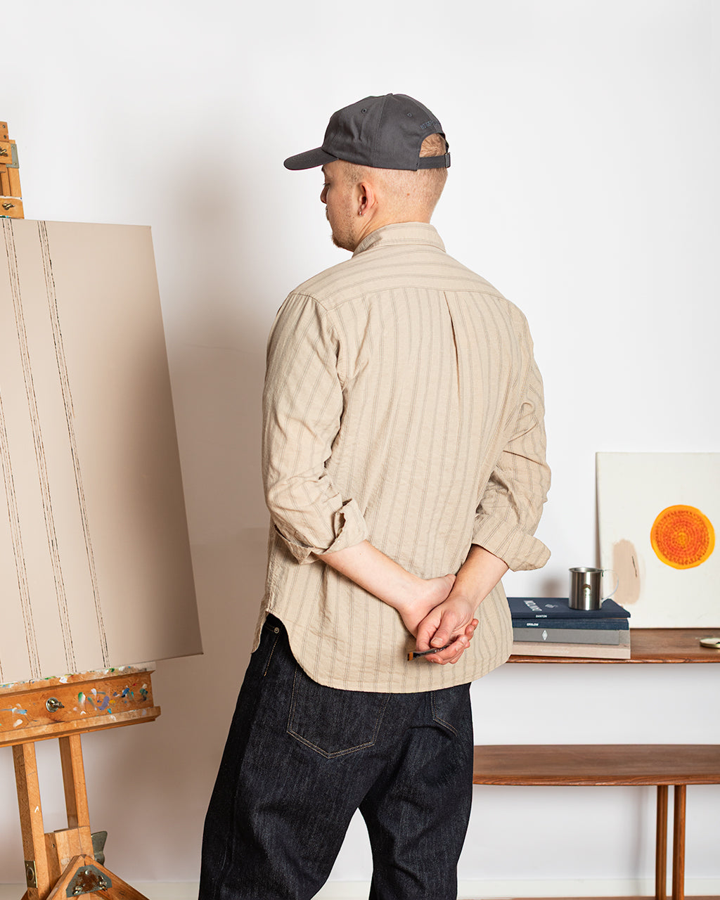 To mark the release, we created a short visual piece centred around the shirt’s defining detail - its woven stripe. The film begins tightly framed on an artist painting a set of repeating lines onto canvas. As the camera slowly pulls back, the scene widens to reveal the artist and his small audience, each wearing the Espevik. The painting becomes an echo of the garment itself, a quiet nod to pattern, repetition and the small design choices that make a piece worth returning to season after season.