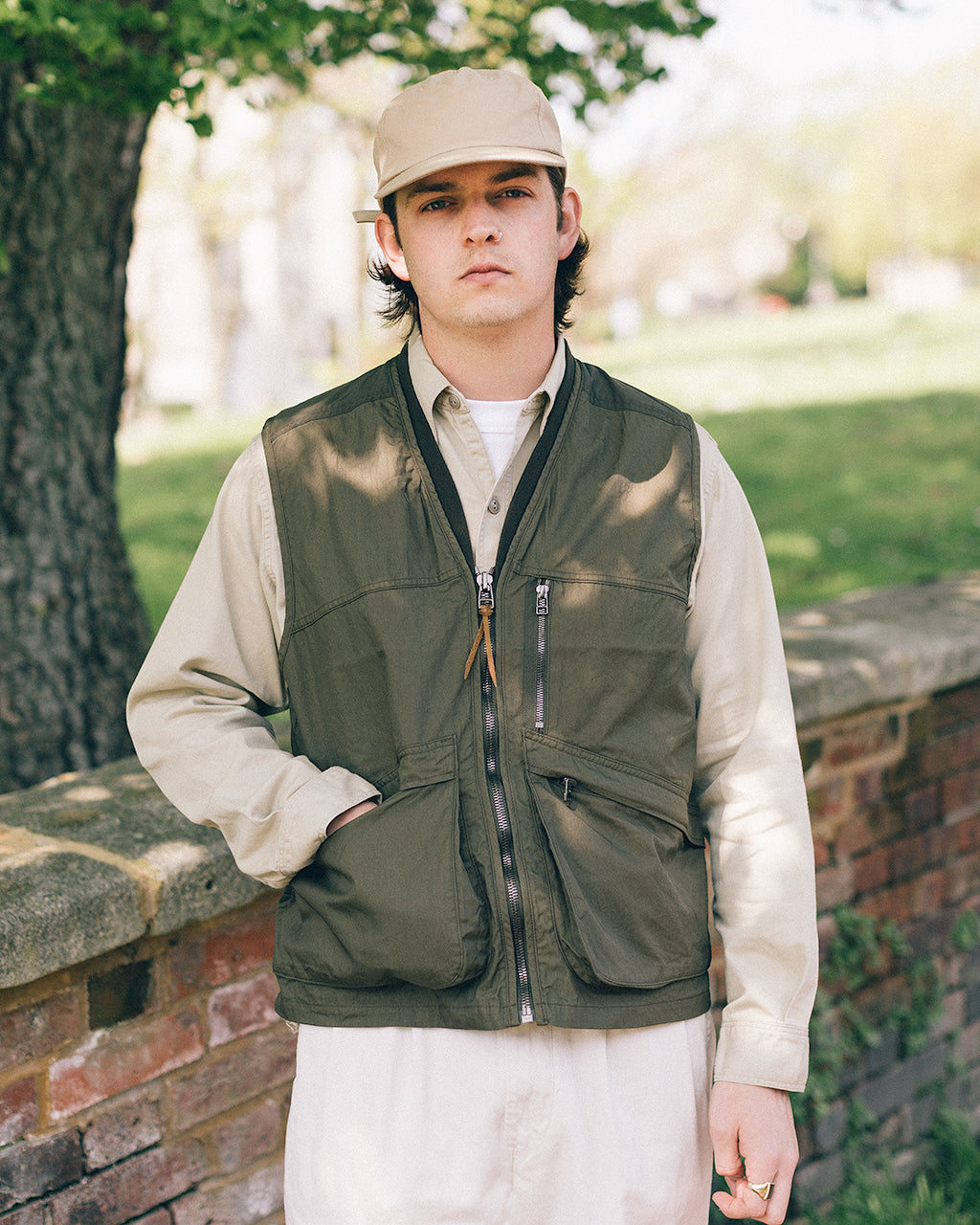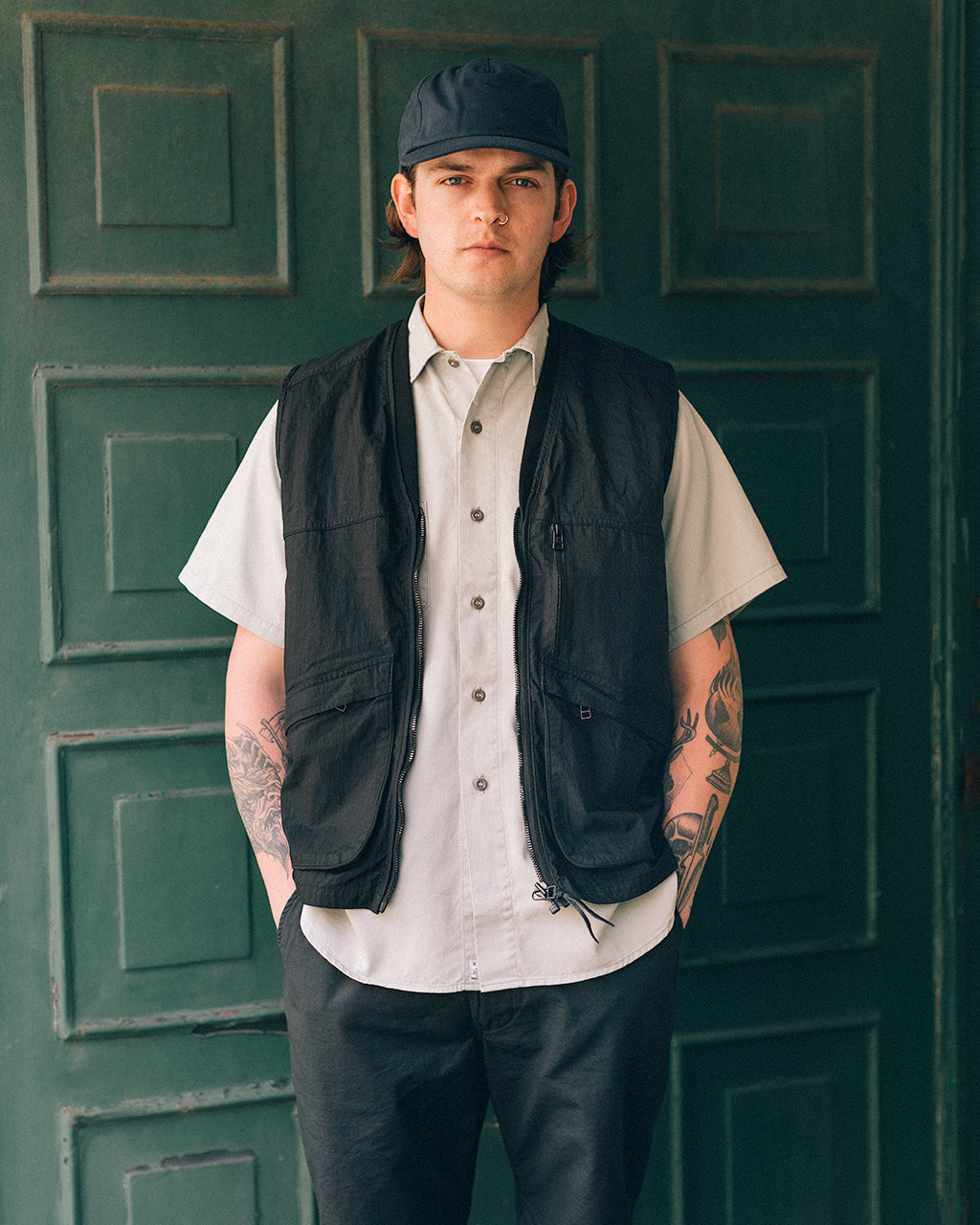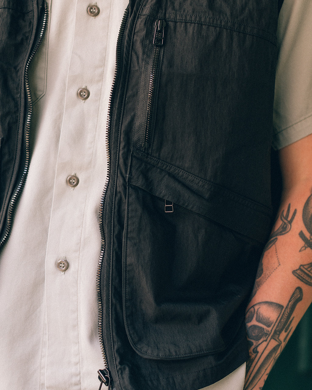 Probably our favourite piece here at Peggs & son. is the Utility Vest. Cut from a cotton/nylon combination, the vest takes influence from traditional fishing/utility vests designed to offer a multitude of carrying options without having to take out an additional bag.