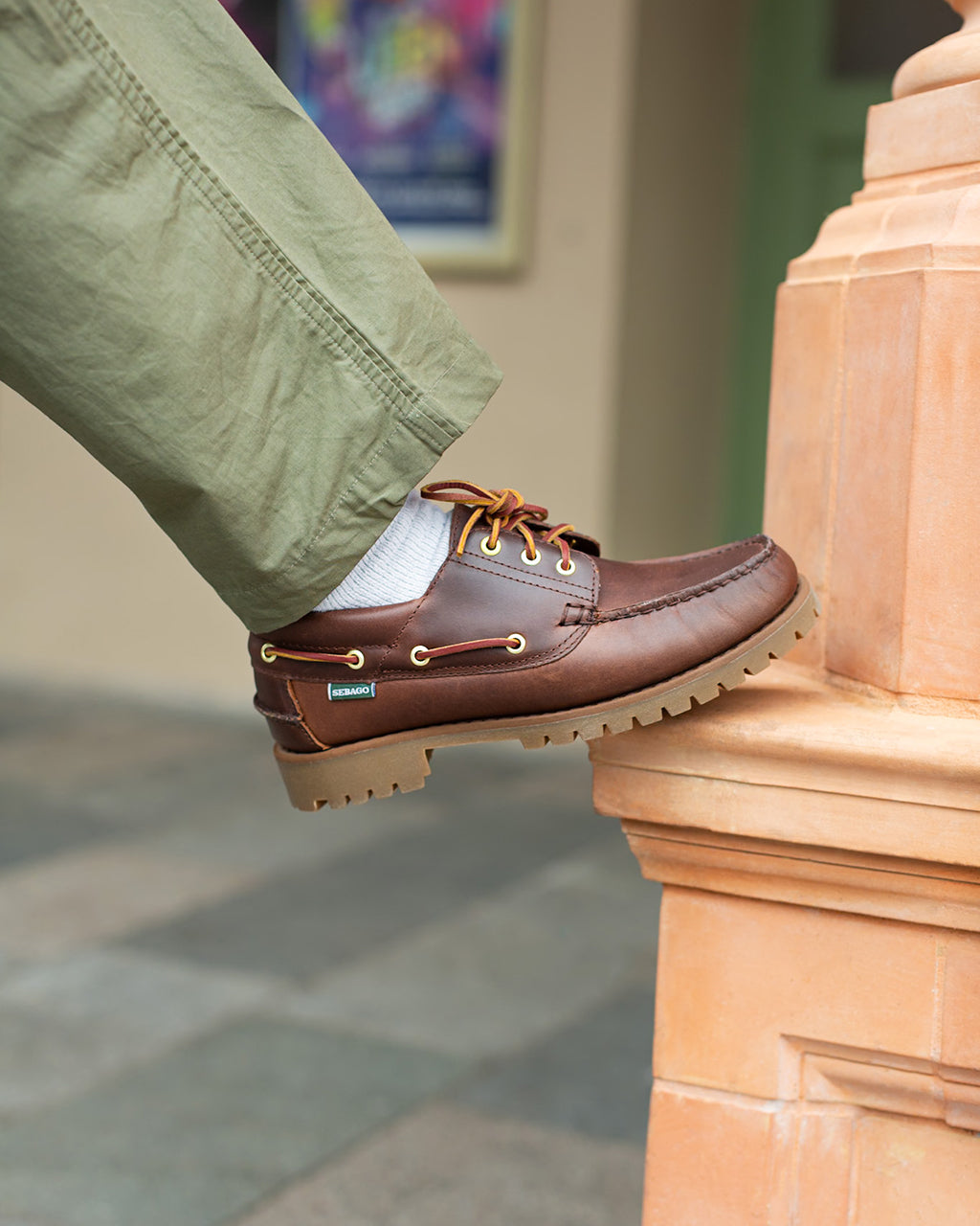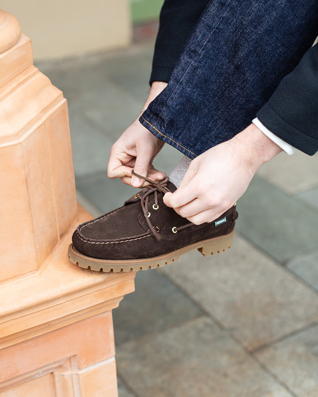 Our take on the Acadia comes in two distinct styles: a rich moka suede with a velvety finish that develops character over time, and a sleek, dark brown leather designed for timeless versatility. Both versions are built on Sebago’s signature lugged sole, offering dependable traction and durability.