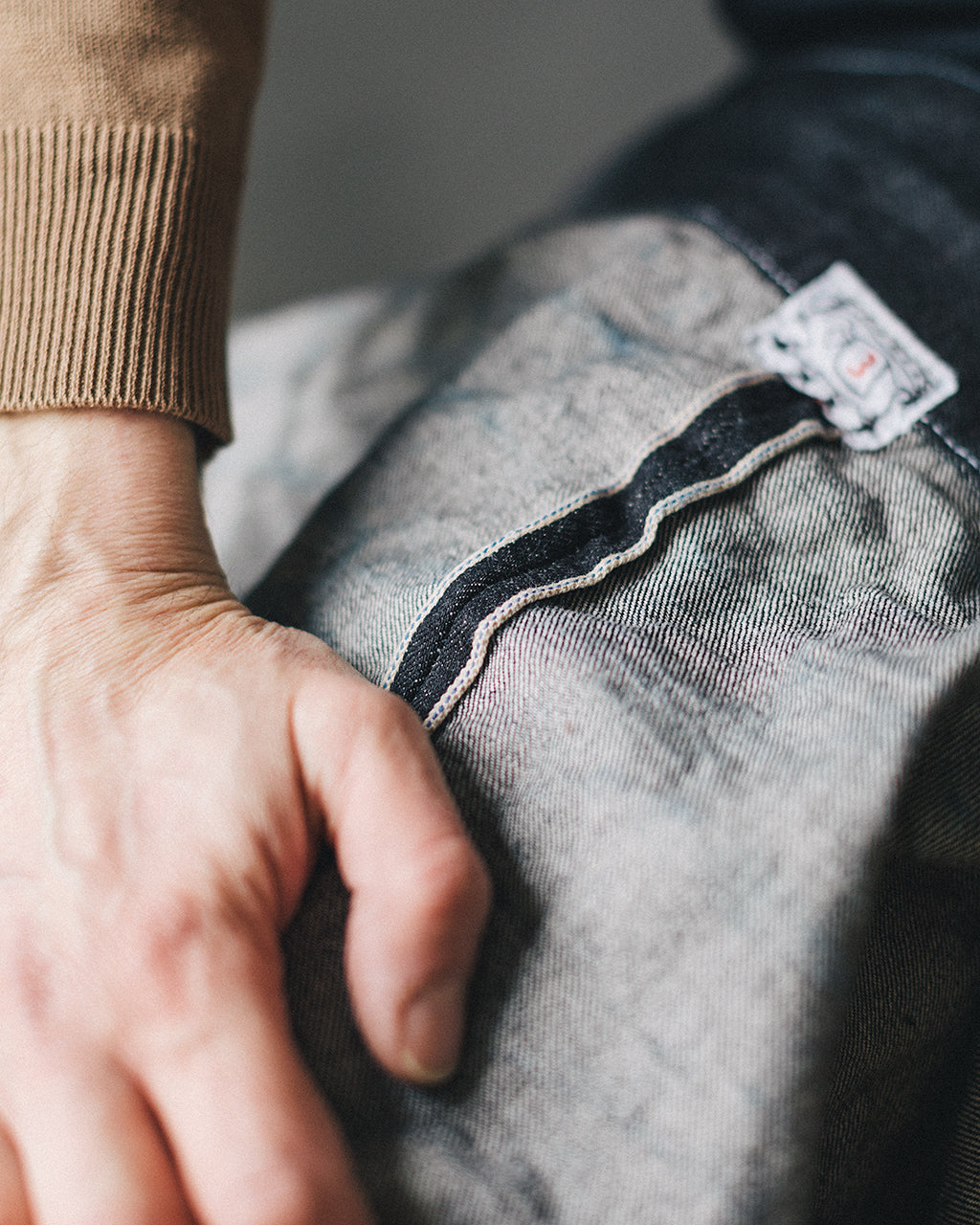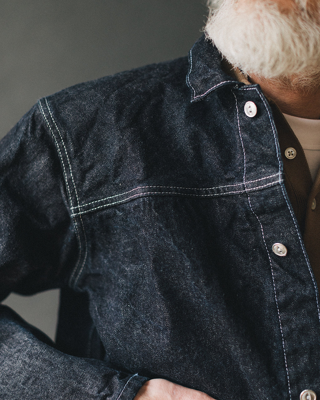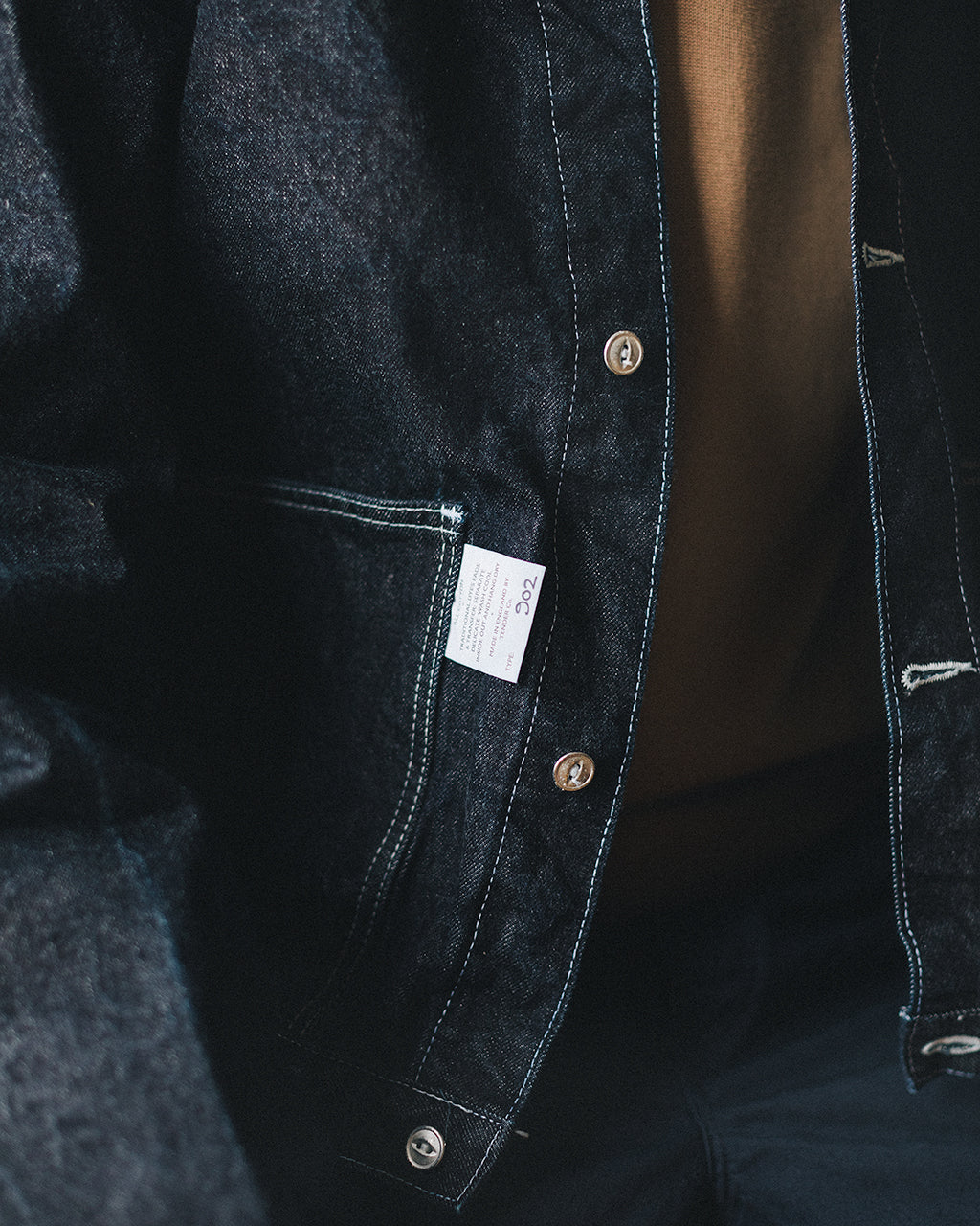 The jacket features two large front pockets and a selvedge detailed center back seams which is part of the 16oz denim fabrication. The fabric is woven on vintage shuttle looms giving it a slubby hand feel which offers texture and substance and is finished with a slight "Rinse Wash", allowing the wearer to develop signature wear marks and patina as you would a raw pair of jeans.