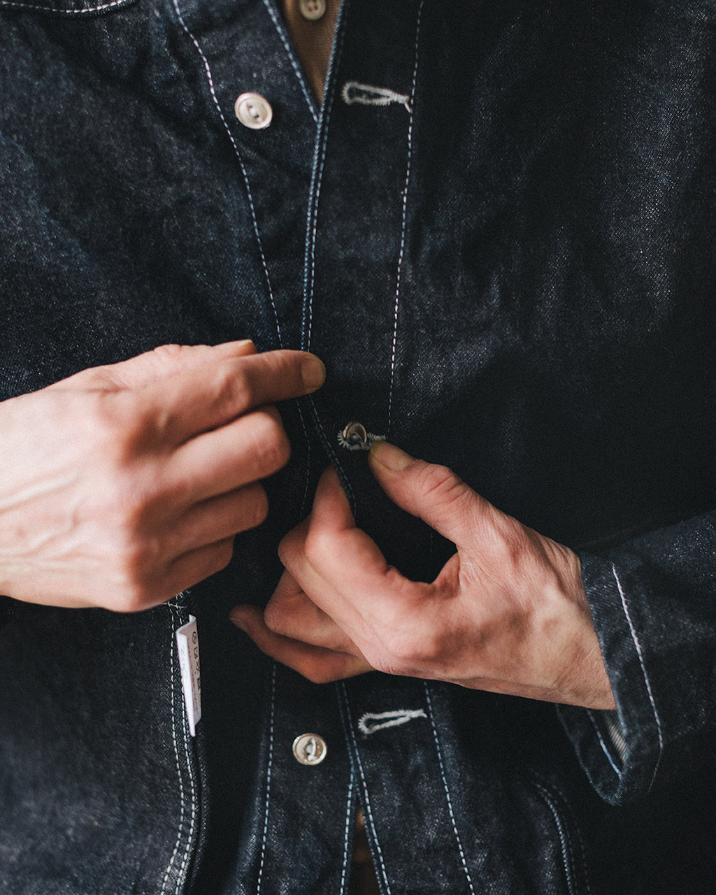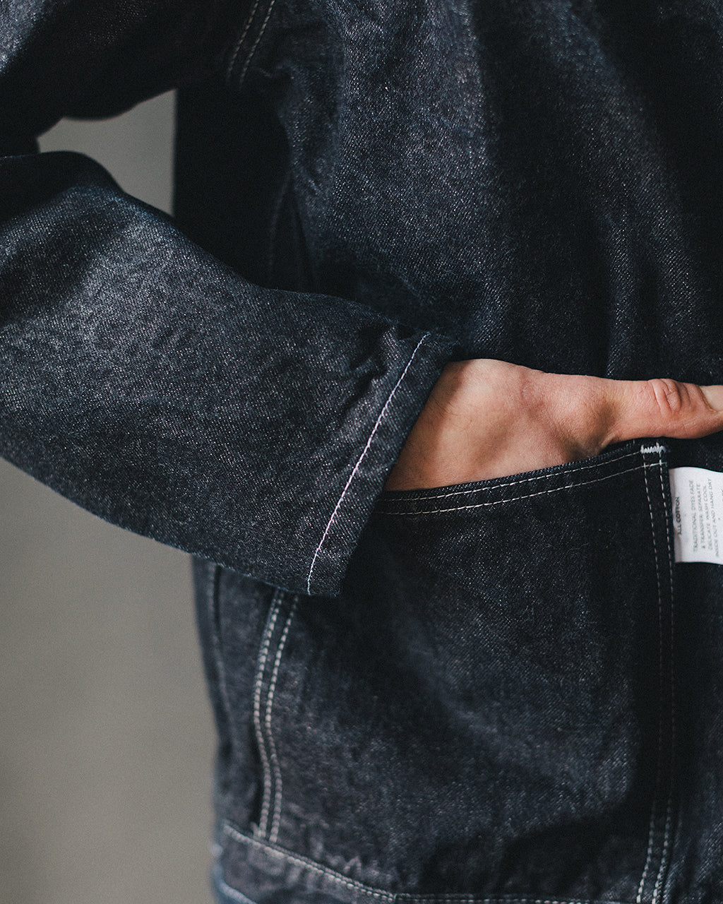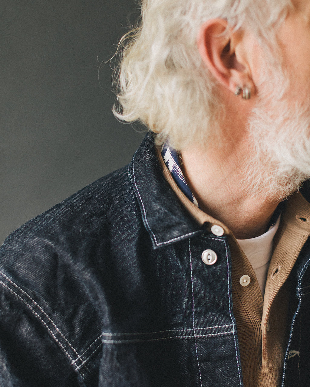The Edited Jeans Jacket is a simplified version of the Type 901 Pleat Pocket Jeans Jacket, cut straight with a centre back seam. The back panels are brought up and over to the front, forming a smooth biased shoulder which wears particularly comfortably.