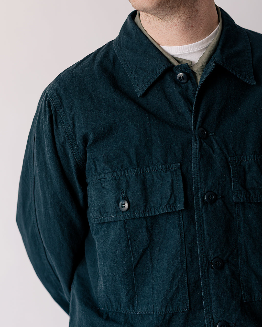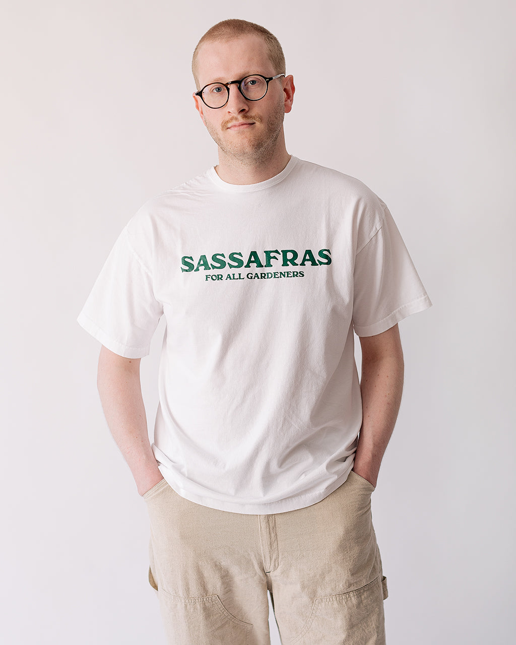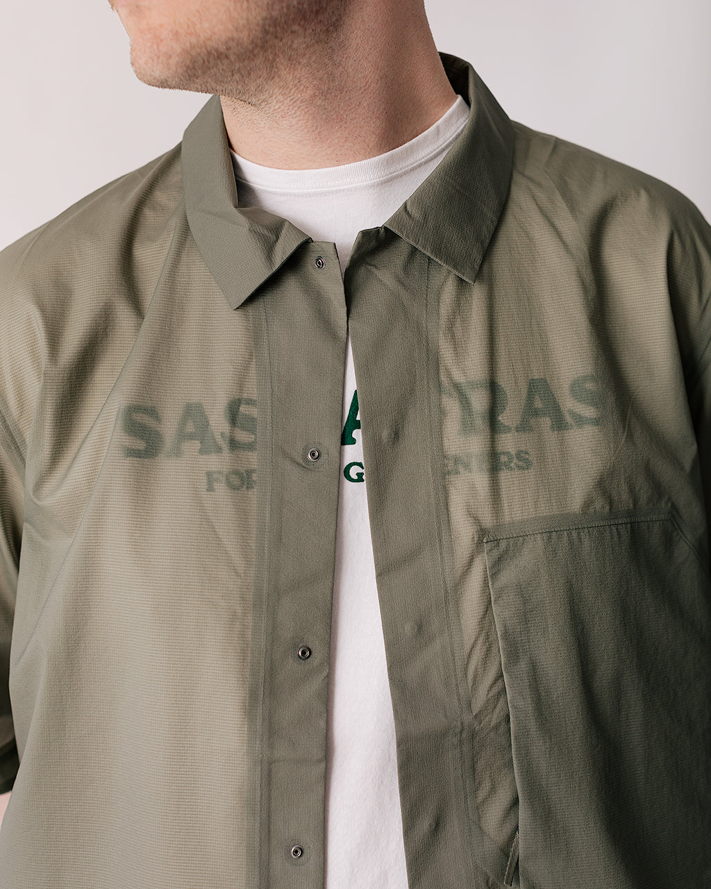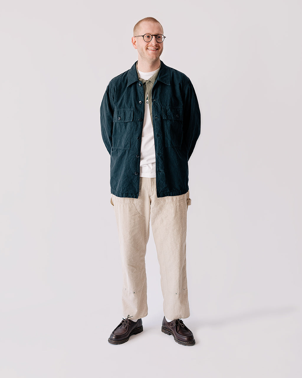 Model is 6', 44" chest, 34" waist and is wearing a size Large Work Shirt, a size Large T-Shirt and size Large Trousers.