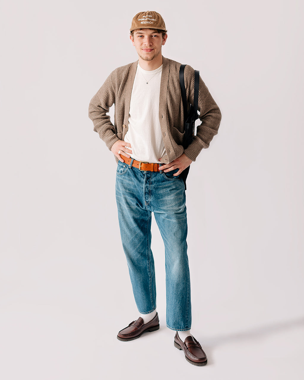 Model is 5'11", 40" chest, 32" waist and is wearing a size 3 Cardigan, a size 42 T-Shirt and size 32 Jeans.